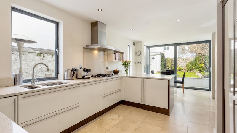 The owners bought the property in 2005 and worked with Phil Coll of Coll + McCarthy architects to extend out to the rear and provide a contemporary kitchen. Set out in a C-shape with deep-drawer storage, a breakfast bar divides the work units from the eat-in area. The tiles underfoot are warmed by underfloor heating and the new build has aluminium glazing and a large sliding door opening to a smart garden bounded by original granite walls.