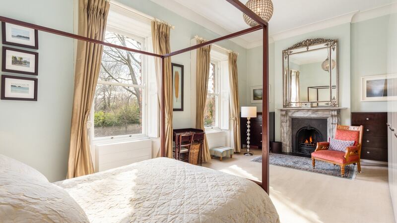 Upstairs, the main bedroom is located in what was originally the piano nobile – a drawingroom where the mistress of the house would receive guests. There are views across the square to the Dublin Mountains. In some neighbouring properties this room has been divided in two to provide four bedrooms. It has a gas fire that the owners regularly light. During lockdown nights the owners say they switch it on for movie nights with the kids to try to recreate a cinema atmosphere.
