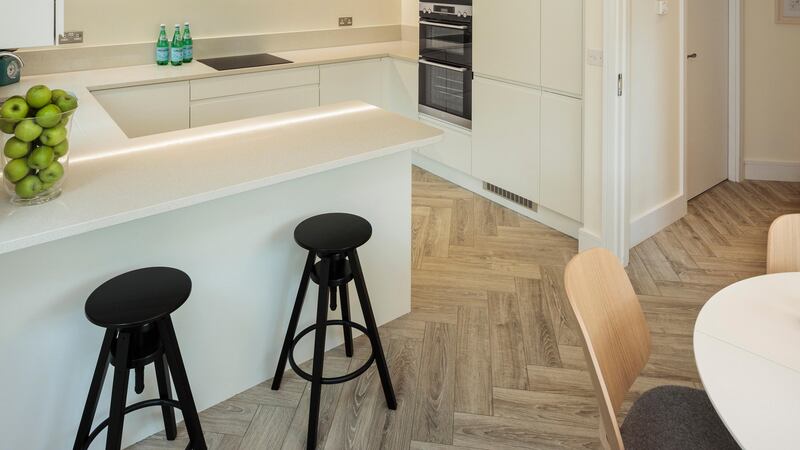 Eily Roe Interiors designed the showhouse and chose a white-limed oak-look herringbone laminate for the hall and kitchen. It too feels soft underfoot, and that’s thanks to the addition of a 3mm ultra-strong underlay. Greystones-based Brereton Carpets supplied the flooring and Gredor Wood did the oak-lined wardrobes in three of the four bedrooms.