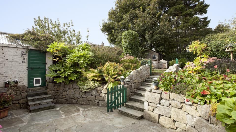 The back garden is fully enclosed with a circular walled patio, then stone steps take you up to a raised lawned area.