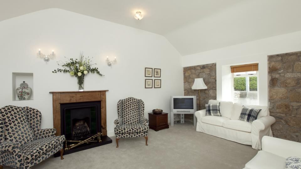There’s a generous fireplace in the livingroom, and here one wall has been stripped back to the original stone, enhancing the cottage feel.