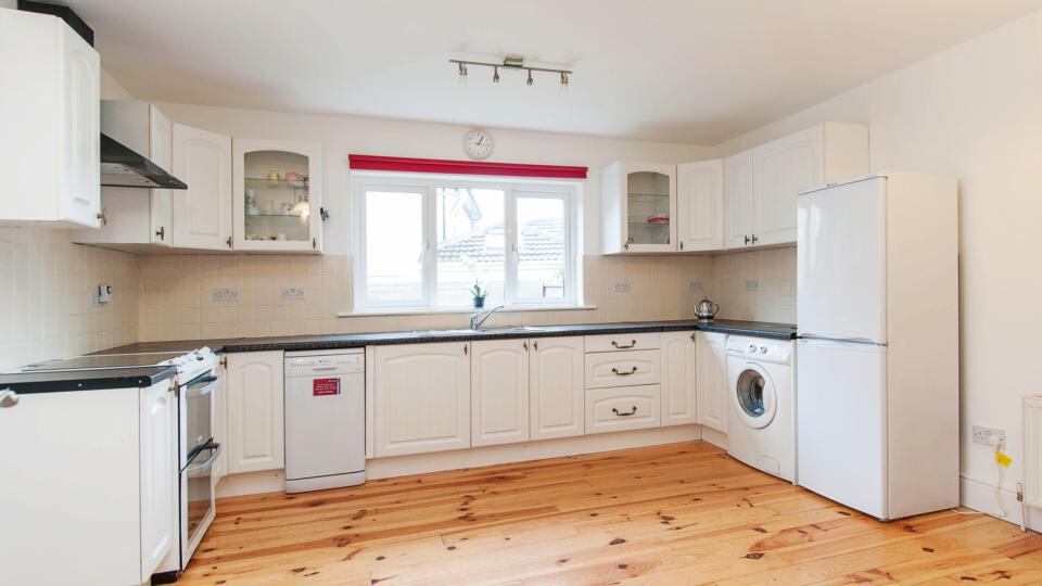 Upon closer inspection, it is revealed as a four-bedroom house; the garage, to the right of the hall door, has been converted with en suite showerroom.