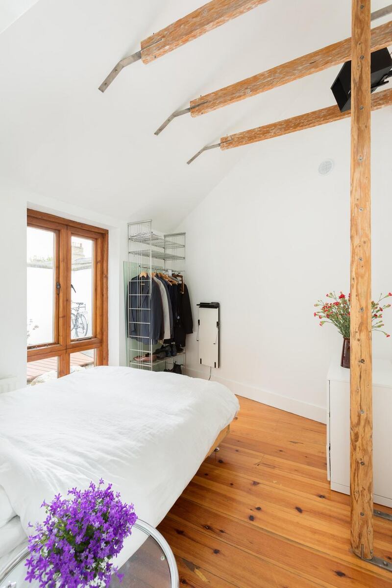 In order to increase the property’s tiny size, they went up a floor into the roof and added a dormer level that would comply with building regulations. This has been well executed and added built-in wardrobes, a study area, and a casement window that opens wide enough to access a small west-facing roof. There’s also an adjoining shower room with a large stall.