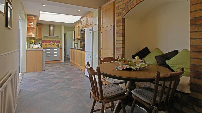 The kitchen-cum-diningroom is to the back of the house. The diningroom has a brick feature wall where the range would have been originally. A roof light illuminates the Shaker-style kitchen shining westerly sun into the middle of the room. To the rear is a utility room and toilet.