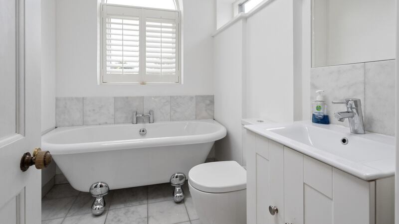 The original fanlight in the family bathroom on the hall return brings in light while a second window overlooking the garden has louvred, privacy shutters. A clerestory window on the exterior wall brings in more natural light. It is a luxurious space clad in white marble tiles with a separate shower and freestanding bath. The first of the property’s four bedrooms is also at this level. These are all doubles.