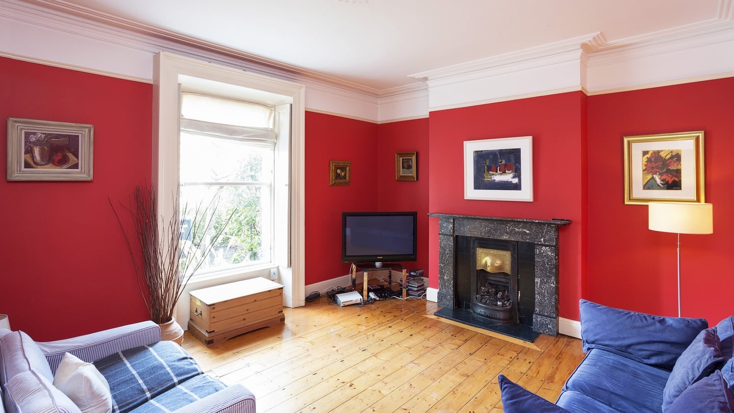 Downstairs to the front of the house is an informal livingroom, with deep crimson walls and the original fireplace. Currently housing a gas fire, new owners could reinstate the open fire.