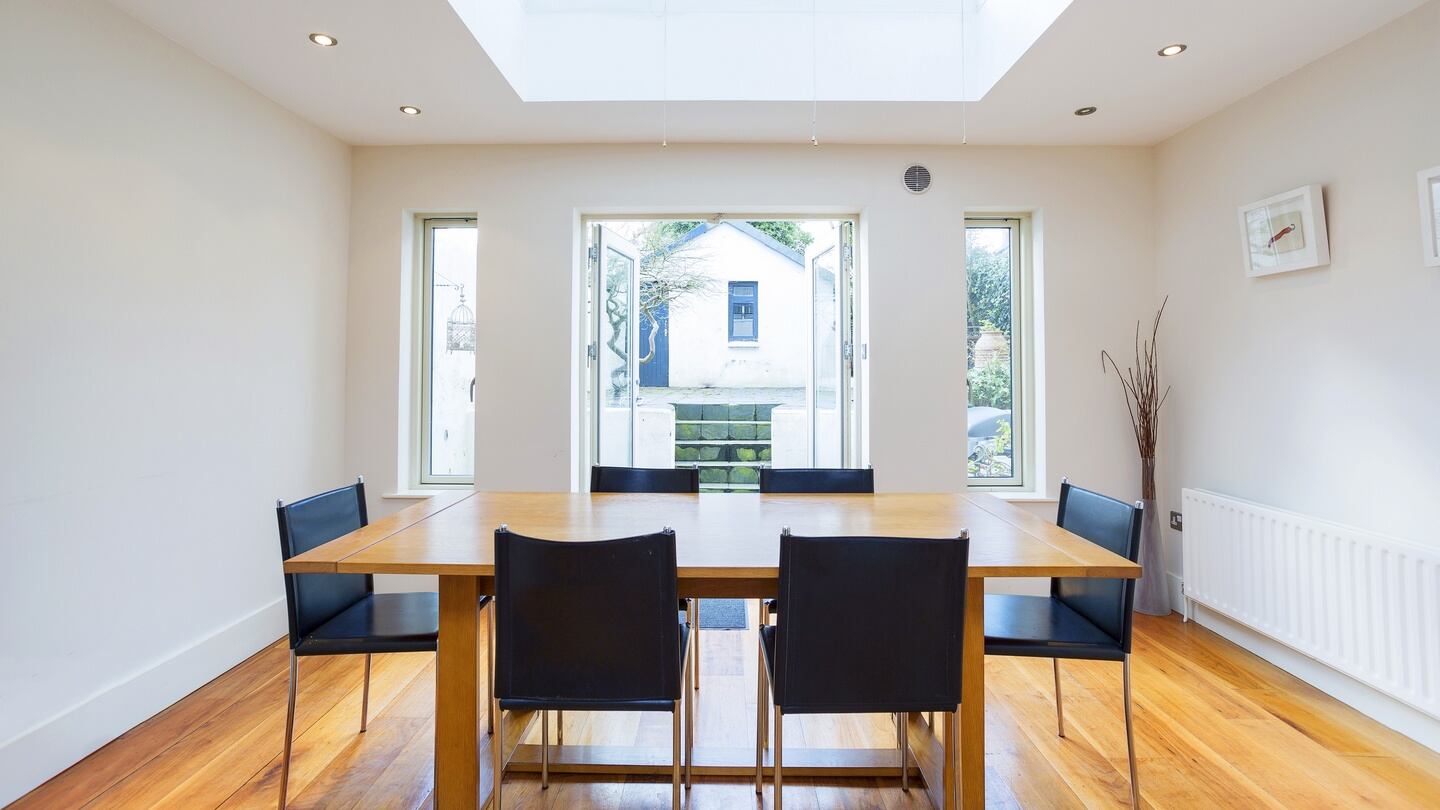 An extension made space for a dining area which is bright thanks to a glass vaulted roof, and French doors to the rear garden.