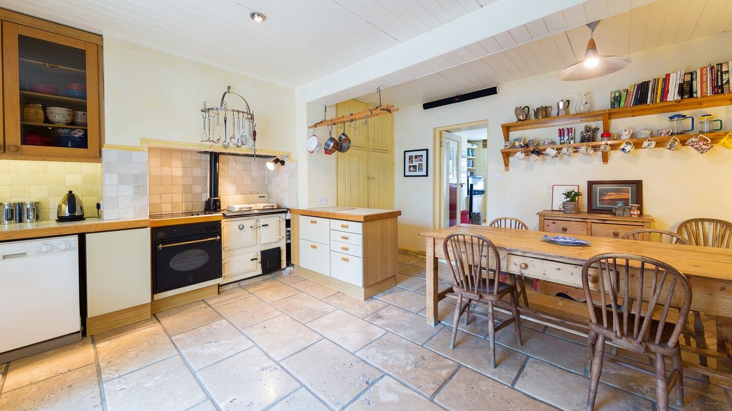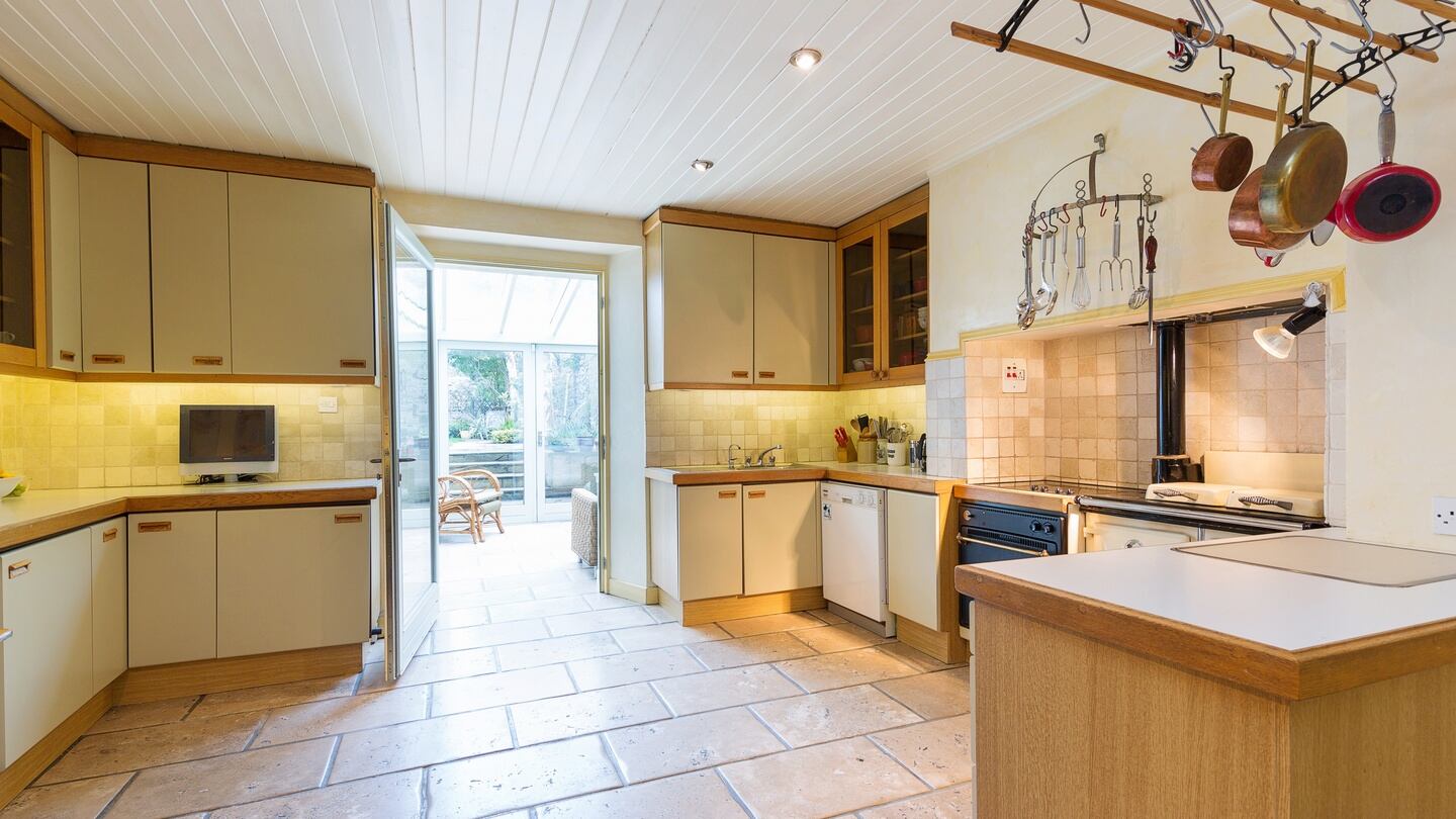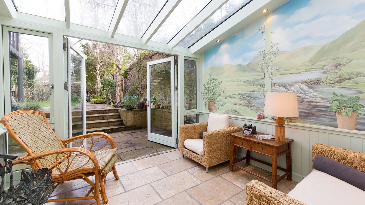 The rustic-style kitchen at garden level is also at the back of the house. Floored with large tiles, it has a Rayburn cooker set into the chimneybreast. A door opens into a sunroom where two walls are painted with countryside scenes. Double doors open into the back garden.