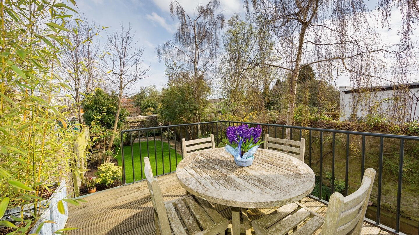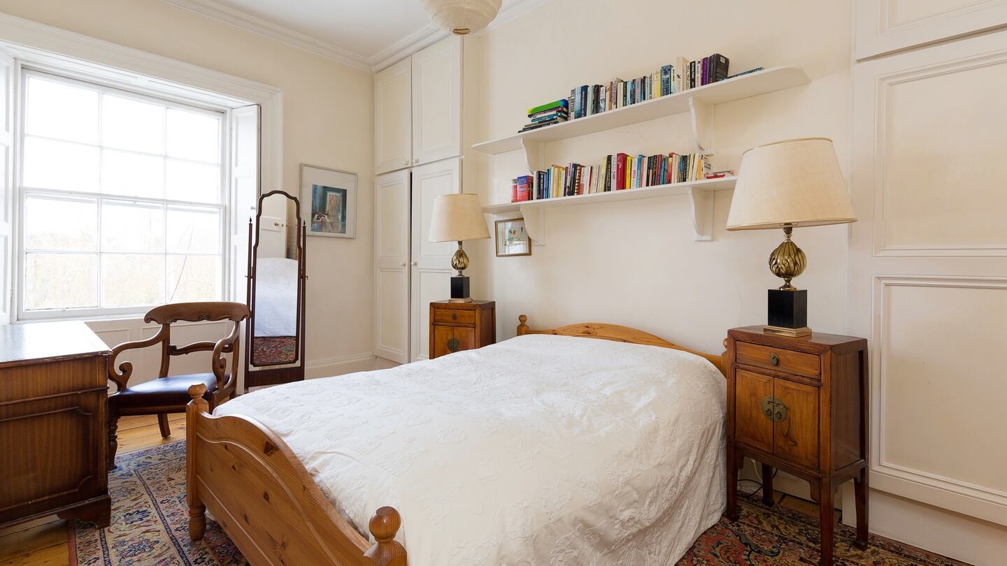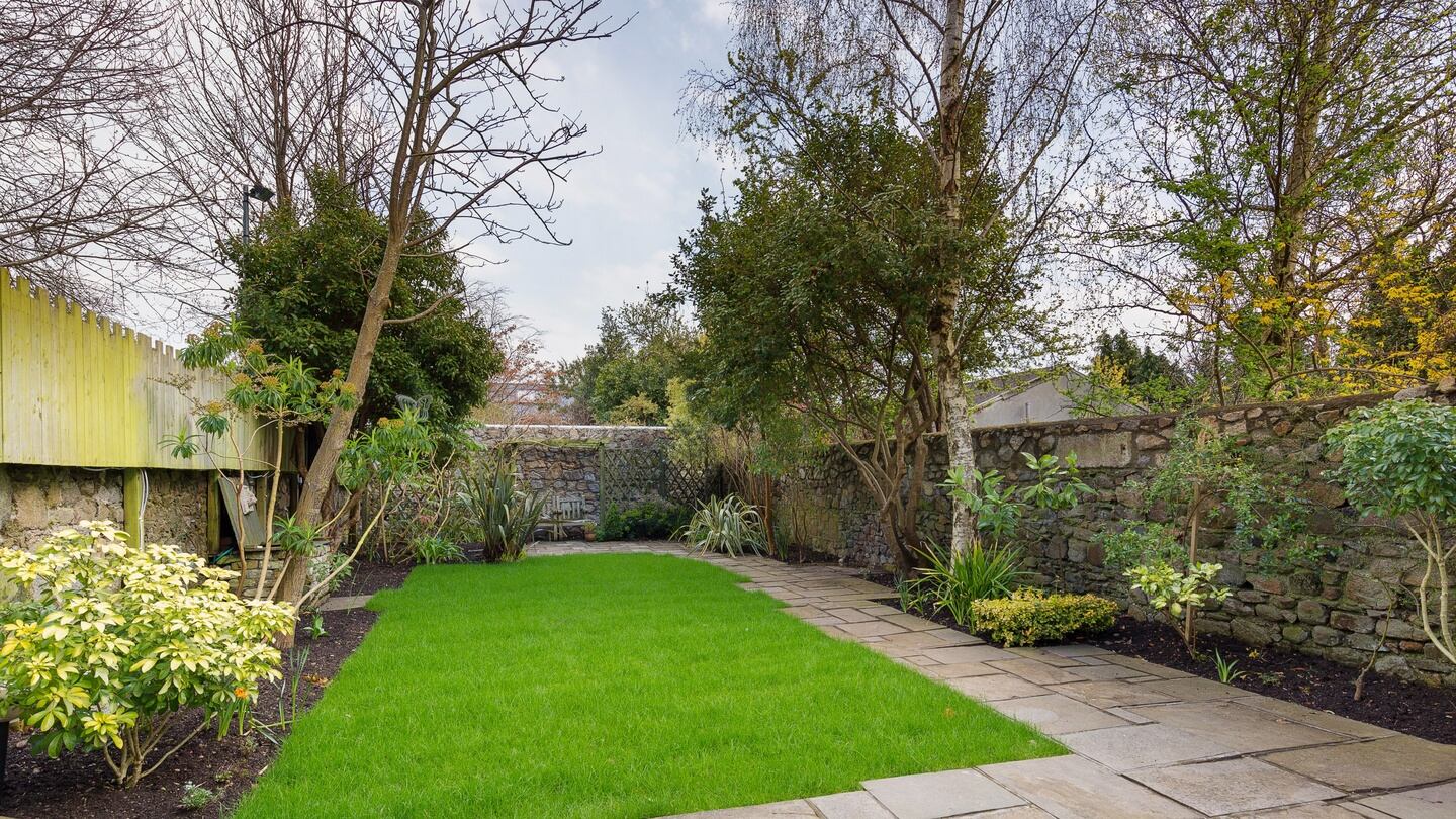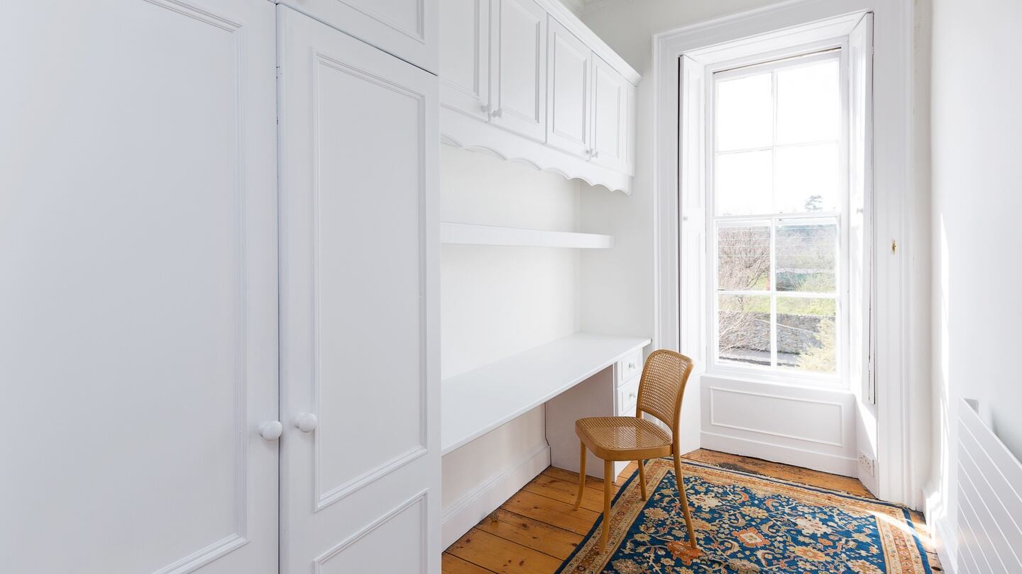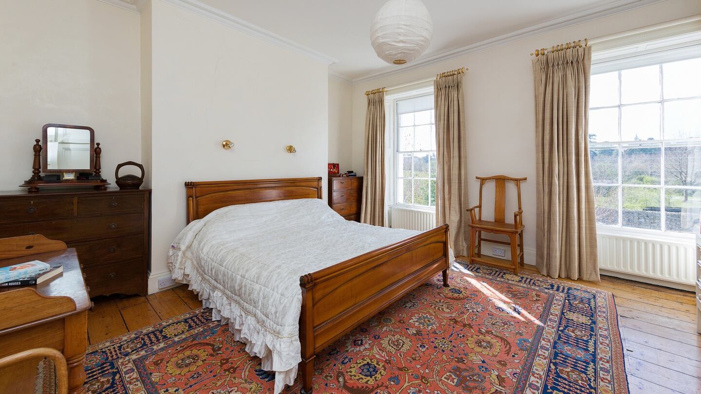 Upstairs there are three double bedrooms and a family bathroom. The large main bedroom spans most of the house’s width and has two tall sash windows looking over Carysfort Avenue.