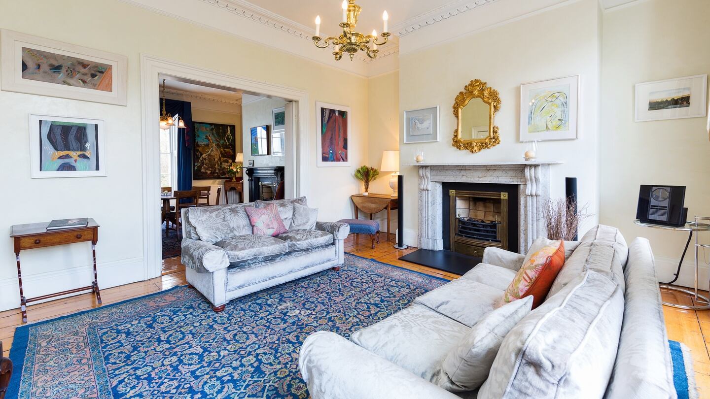 The tall grey-blue front door opens into a bright hall lined with the owners’ artwork; a fanlight over the front door is an attractive colourful stained glass feature. The drawingroom on the right of the hall has two very tall and gracious sash windows in the drawingroom and a white marble fireplace with black slate inset. Double doors open into the interconnecting diningroom, which has a black marble fireplace: the decorative plasterwork fanning out from the ceiling’s centre rose has a delicate design.