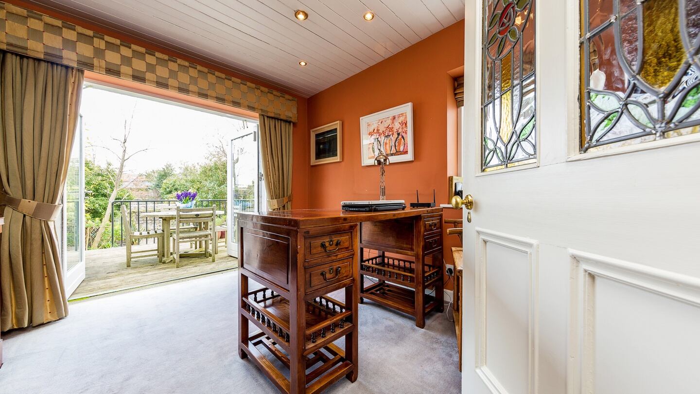 At the end of the hall a door with stained-glass panels opens into a study with walls painted a vivid terracotta. Double doors open on to an outside deck from which steps lead down the back garden.