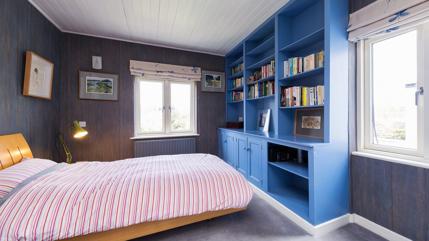 The room described as the fourth bedroom is long and narrow, with a wall of built-in wardrobes and a ladder leading to a loft-style bed. New owners might be inclined to turn this into a walk-in dressingroom.