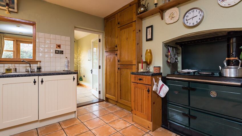 To the rear lies a kitchen with a Stanley range set into what was the old fireplace, and a sun room which opens out on to an Indian sandstone patio.