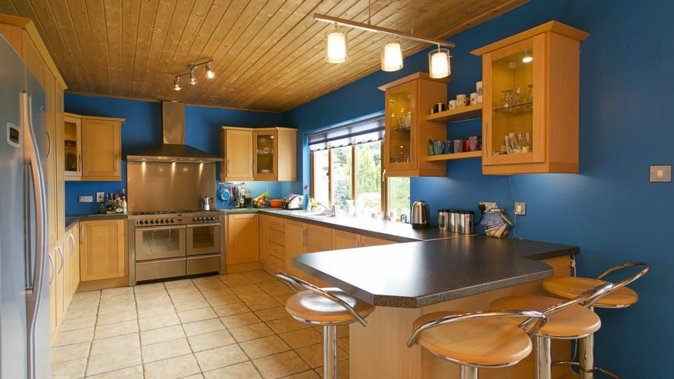 Owners Henry and Hilary King built the huge extension 14 years ago and the house is now about 267 sq m (2,874sq ft) in size. This created a very large, open-plan livingroom/diningroom with a steeply pitched timber ceiling and huge windows taking best advantage of the views. There’s a bar in one corner of the room and a Stovax wall-mounted wood-burning stove. Most of the floors are tiled and there is underfloor oil-fired central heating throughout .