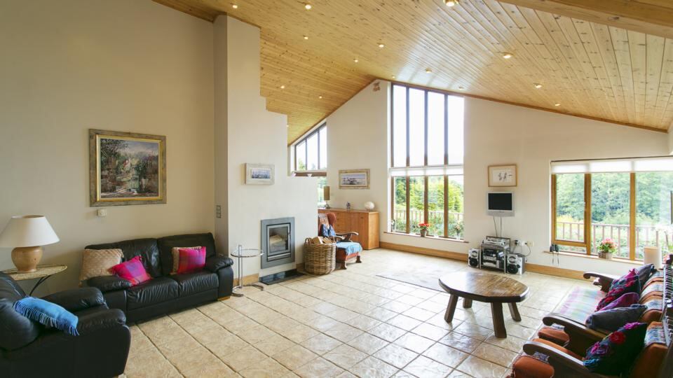 Solar panels also heat the water in the bright summer months. Extending also created a large main bedroom, again with a high, pitched timber ceiling: it has a walk-in dressingroom, a good-sized en suite – and views of the Sugar Loaf.