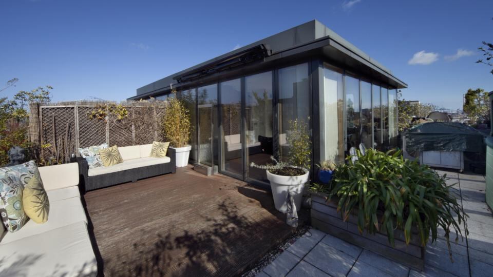 Doors on two sides lead out to private terraces, the larger of which has a westerly aspect and an automated, retractable canopy for those rare days when the sun splits the stones. The only drawback is a large air-conditioning unit that separates one terrace from the other.