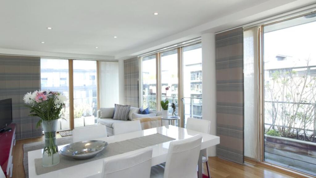 Built in 2006 and designed by O’Mahony Pike architects, 99 Hanover Dock is a penthouse that comes with 80sq m of outside space that boasts views of the river Liffey from one balcony and Grand Canal Dock and the Poolbeg towers from its rooftop terrace.
