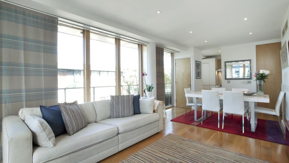 The first of the property’s two reception rooms is to the end on the left. Open-plan, it comprises a living dining room and has a balcony that wraps around it with views of the Liffey, where you could, on a fine day, monitor the river traffic.