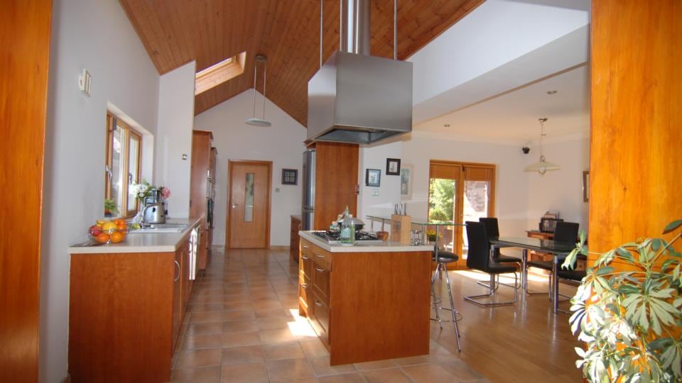 There are great sea vistas too from most of the rooms downstairs, in the open plan sittingroom and the adjacent, lower-level diningroom, where the beautiful briny is glimpsed through a bay window. Although the views are captivating, it seems a shame not to capitalise on them with more glazing – say a glass wall – to better frame the scenery. The cherrywood kitchen has a pitched ceiling that lets in more light via Velux windows in the roof.
