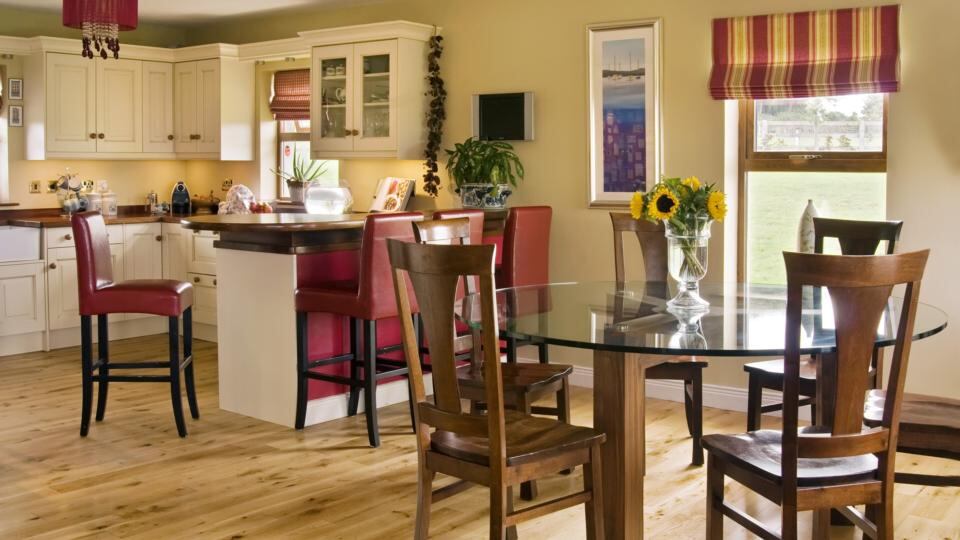 The country-style kitchen handcrafted by Hausmann Kitchens features Iroko worktops and a double Belfast sink with a breakfast bar acting as a partition to the dining area.