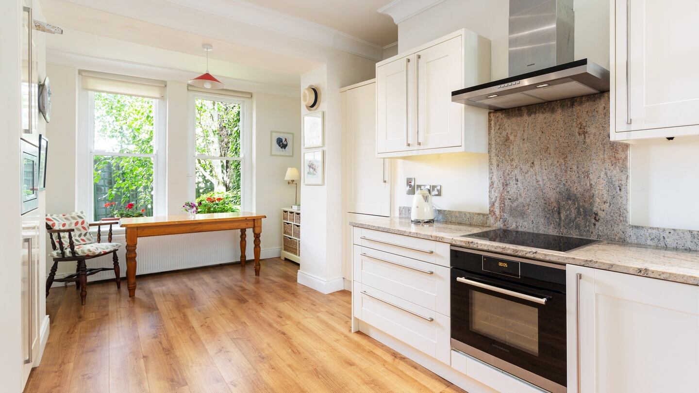 Upstairs, the spiral staircase opens directly into the fine living room with its three distinctive bow-shaped windows. A period-style white marble chimney piece was sourced as the original was missing and the owner admits that when they moved in, for heat-saving reasons, they lowered the ceiling – something new owners will undoubtedly reverse.