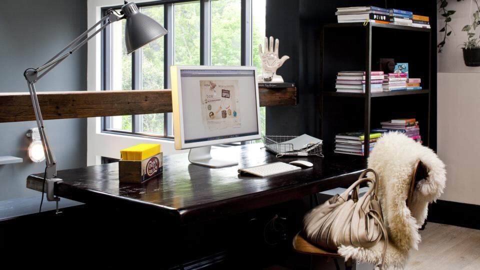 Throughout there is evidence of Carla’s credo; to reinvent, reimagine and repurpose. In the large open plan kitchen and double height sitting room there is a lounge area that she has screened off from the home office, where she runs her graphic design company Design Etc, by covering the metal-frame doors in leopard-print hide. While most of the house is light and airy she has opted for a dark and moody colour scheme here. It is a theme that she also exploits in other rooms. In this room the underlit stairs up to hall level add illumination.