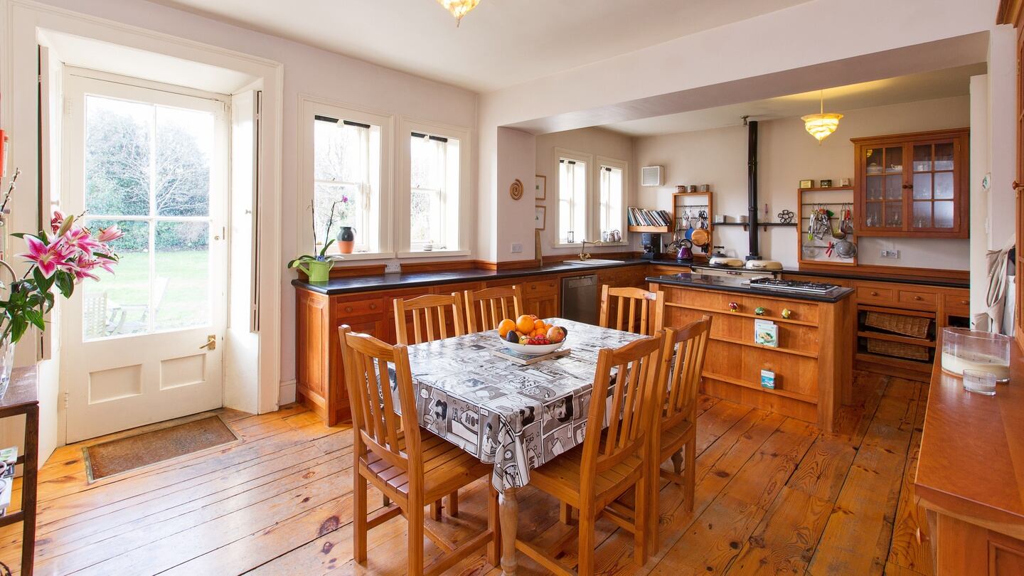 Rewired in 1991, replumbed in 1996 the kitchen was extended in 1997 and now comprises an open fireplace at one end and a four-door cream Aga at the other, with room for a kitchen table. Cherrywood kitchen units by Clive Nunn, a well-regarded furniture maker who passed away last year, surround the space. These have bull-nose unhoned limestone countertops.