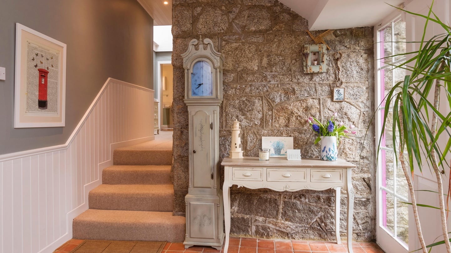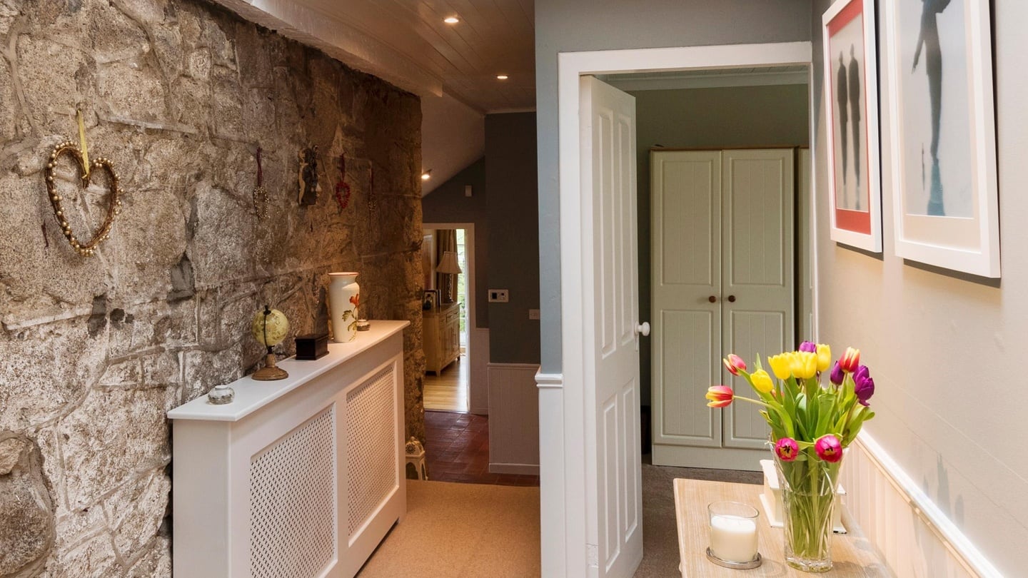 Accessed via a shared driveway to which the house to the rear has a right of way, the original cottage has been completely reconfigured and more than doubled in size. On entry, the original cut-stone walls are visible in part of the entrance hall, floored in square terracotta tiles, and also bordering the corridor down to the accommodation.