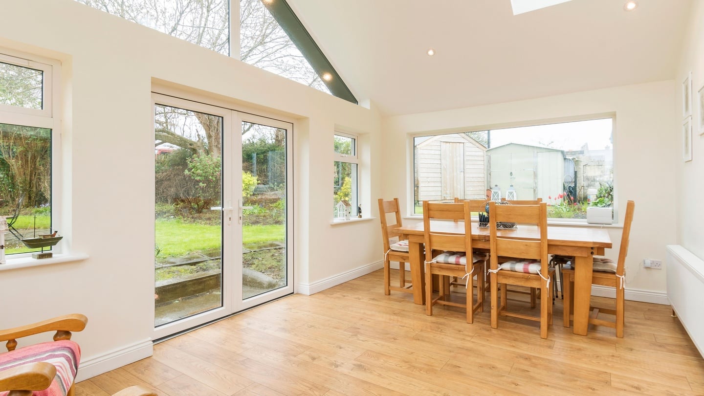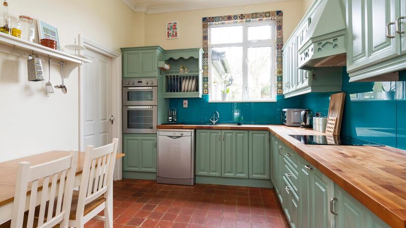 Doors lead off into a sunroom to the rear, a good-size space that was upgraded from an existing conservatory, and through to the kitchen, where timber units are painted a soothing shade of sage green. Coloured glass splashbacks, a fashion that has really stood the test of time here, add additional impact. The large window over the sink is framed with hand-painted ceramic tiles to create a feature, a simple idea that has been well executed.