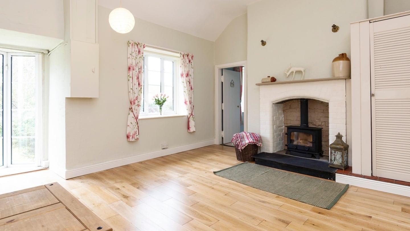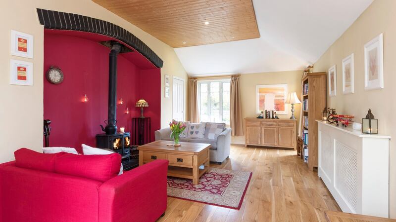 The living room and kitchen are located in extensions added by a previous owner and lead off the smartly tiled hall. The living room, standing to the left, is set around a large country-style chimney breast housing a solid fuel stove. The chimney breast has been painted an after dark shade of deep mauve.