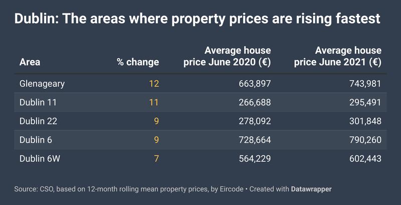 Overall, property prices rose by 6.9 per cent in the year to June 2021, with Dublin prices up by 6.4 per cent and prices outside Dublin growing by 7.4 per cent, according to figures from the Central Statistics Office.