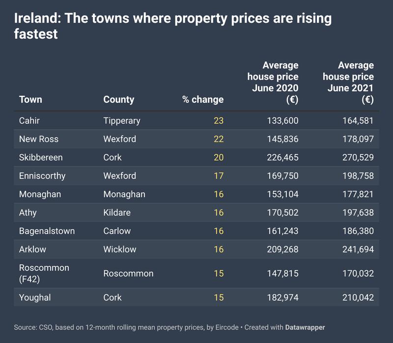 Indeed, Cahir is not alone in posting double-digit growth. New Ross, in Wexford, Skibbereen, in Co Cork, Athy, in Co Kildare, and Glenageary, in south Co Dublin, are just some of the towns and postcodes in the larger cities where prices have grown at far faster rates than national averages.