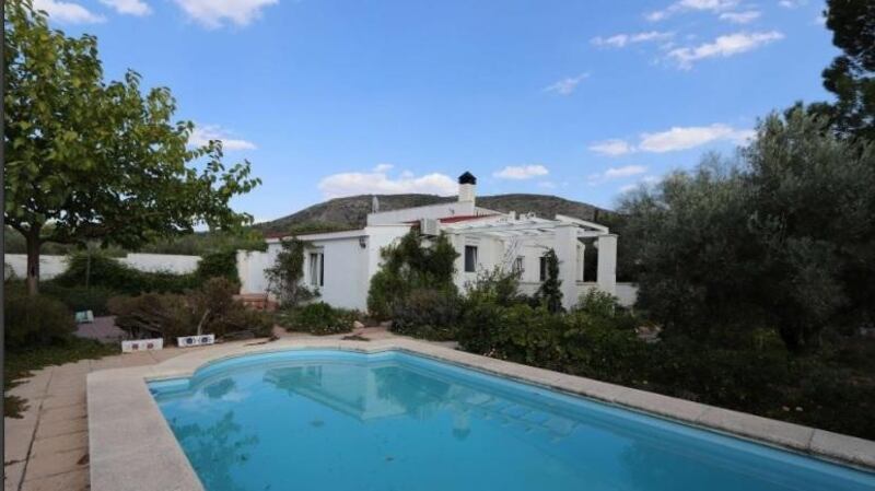 This detached villa is a couple of minutes' drive from Sax town and half an hour inland from Alicante airport and the sea. The house sits on its own land which includes a mature garden with trees, plants and shrubs, a grove of 80 olive trees, a swimming pool, two outhouses and a shed. A terrace outside flows into a conservatory. There is also a living room with a fire, a kitchen, four bedrooms (one with patio doors out onto the terrace) and a bathroom with walk-in shower. The roof terrace has views over the countryside and Sax town which has shops, bars and restaurants, a theatre and restored castle, which is lit up at night. Price: €179,995