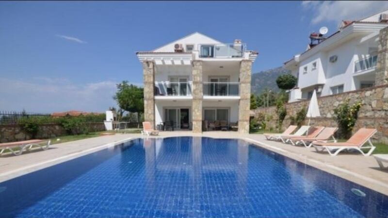 Sitting at the foot of the pine-rich Babadag mountain in the resort of Ovacik, this house has its own swimming pool. Further swimming can be done at Oludeniz beach, which is reached via a walk down a winding mountain road. This modern, glassy villa has a marble staircase in the front hall. Downstairs is an open-plan living area with glazed doors onto a shaded terrace. The dining area beside the kitchen is in a conservatory style. Upstairs are two en-suite bedrooms that open to a balcony overlooking the pool.