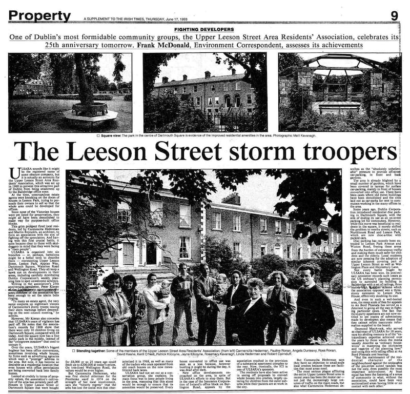 By then, Ulsara had organised itself into six branches representing Upper Leeson Street, Leeson Park, Appian Way, Dartmouth Square, Waterloo Road and Wellington Road. As I noted in 1993, they all kept an eye on what was happening in their areas, carefully monitoring Dublin Corporation’s weekly planning lists to spot unwelcome developments.