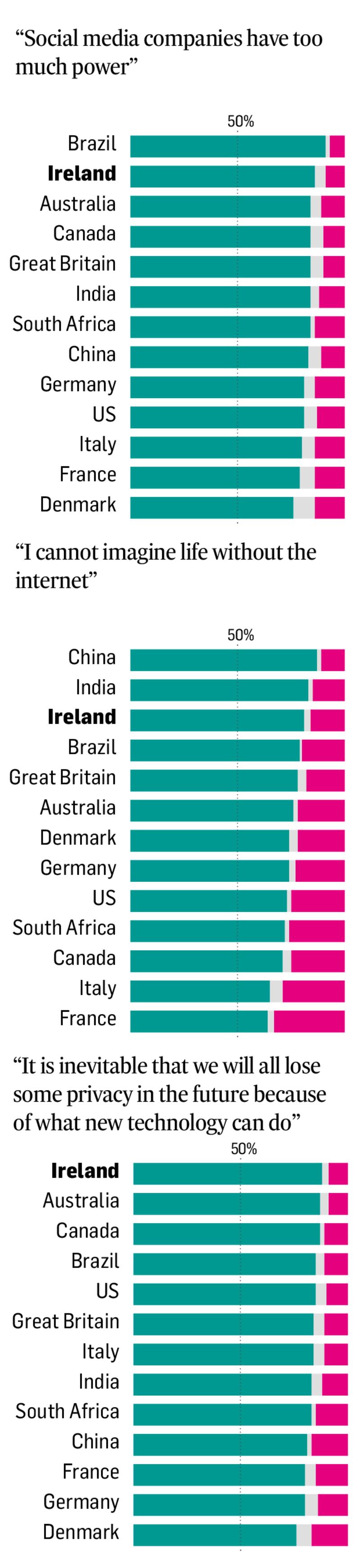 More Irish people believe it is “inevitable that we will all lose some privacy in the future because of what new technology can do” than those in any other country, with 88 per cent of people accepting that it will happen, placing us ahead of Australia and Canada who were tied on 87 per cent.