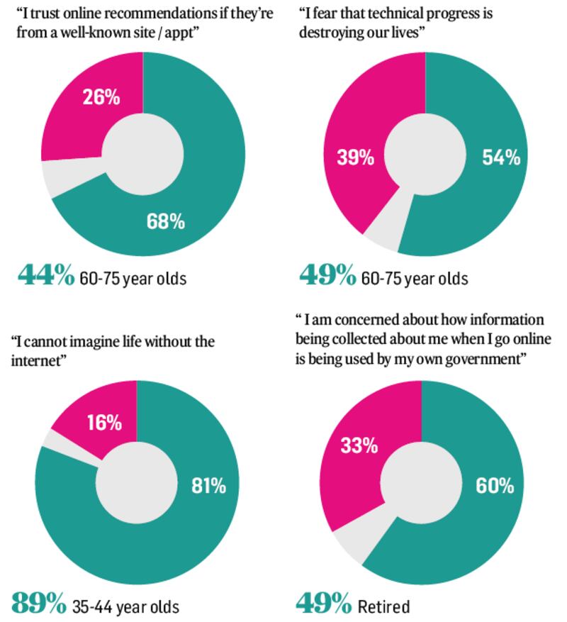 And while we do appear to be more reliant on the internet than most, when presented with the grim statement, “I fear that technical progress is destroying our lives”, 54 per cent of Irish people agreed. People from Brazil and France on 66 per cent were most likely to agree, while Germans were the least likely to agree, with a still significant 45 per cent of people there agreeing that tech progress was “destroying our lives”.