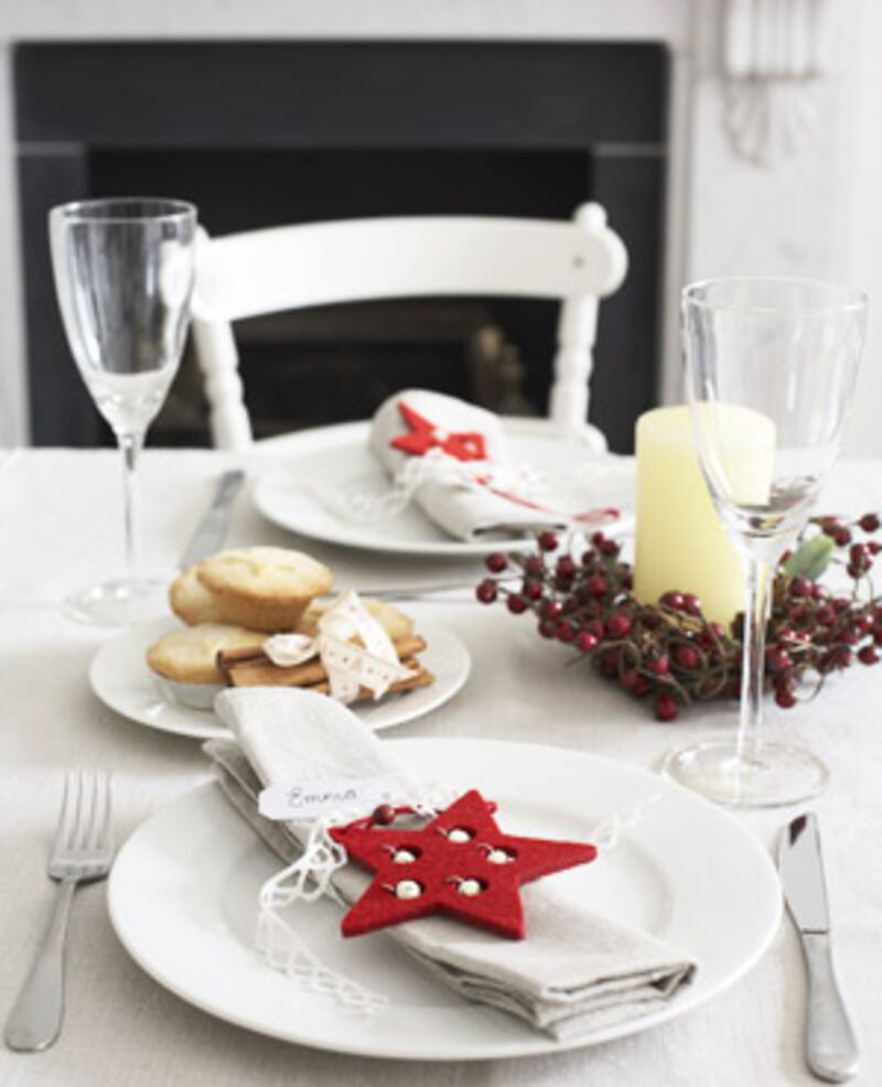 This simple cream linen napkin wrapped with a length of lace and decorated with a red felt star, featured on All About You, creates a pretty place setting. Use any small decoration that takes your fancy, and don't worry about using different decorations for each place setting. It will charm guests whether a get-together supper or the big meal on December 25th. Allaboutyou.com