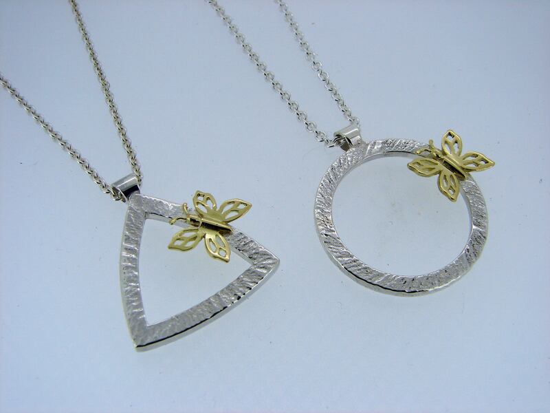 . Kilkenny-based Marie-Thérese Walker turned heads at the craft fair with a show-stopping gold pendant she made for a client with butterflys, peridot , amethysts and seed pearls - the colours of Suffragette jewellery. Butterflys figure largely in her work . Her hammered silver and 18ct gold “butterfly landed” necklaces are to die for and cost around €225. She says she is the only goldsmith in Ireland certified to work with fair trade gold. See