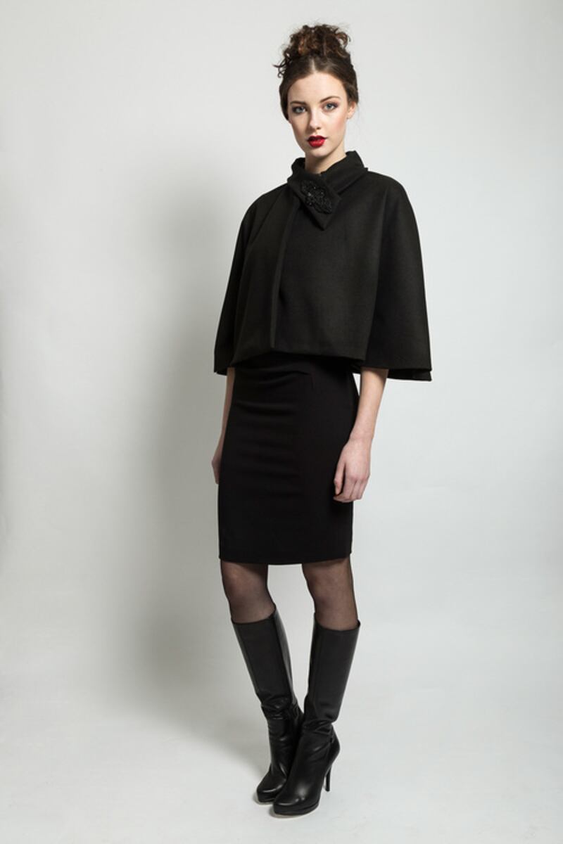 Award winning fashion designer Jennifer Rothwell’s modern and slightly edgy autumn/winter collection features a black capelet, (€290) with intricate collar detail. Also check out her long red pleated cowl neck dress, (€395).