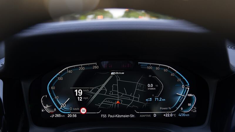 And I know, you’re all going to want to know, like the hooligans ye are, if you can drive the 330e, and the good news is you can. The car is about 200kg heavier than a standard 3 Series, but the centre of gravity – you remember we worked that out last year with the string and the lead weights? – is actually a little lower, and it still has 50:50 front:rear weight distribution. So, to be honest, you just don’t feel the weight – it’s as nimble, and as agile as the standard car, and has the same brilliant steering feel. So yes, it’s fun, big fun, even if you are trying to save the planet at the same time. It also looks the same as a standard car, as BMW has removed the old e-Drive badges from the back, so it’s only the 330e badge and the flap for the charging plug that give it away. The interior’s the same too, aside from some trick bits that show you more electric running displays in the big digital instrument screen.