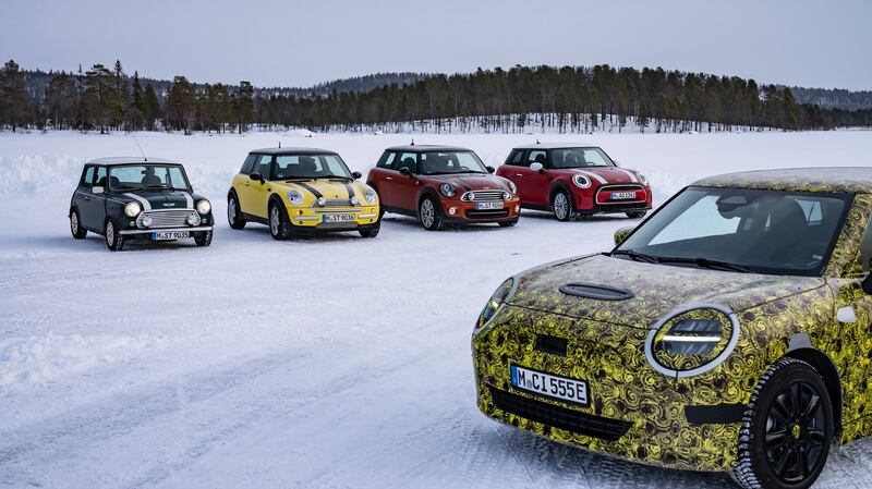 Now though, it looks as if the Mini will shrink a little when the new version goes on sale next year. Or at least this fully electric one seems as if it will. It’s a little hard to tell from these camouflaged prototypes of the new Mini EV running around north of the Arctic Circle, near the Swedish town of Arjeplog, but the front and rear overhangs do look a little shorter than those of the current Mini hatch.
