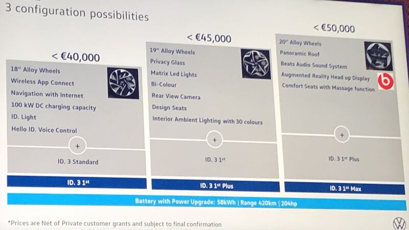 For those outside the 400 pre-bookers, there will be a chance to see the new ID.3 on Friday and Saturday on Grafton St, Dublin and then again next summer, when VW's sponsorship of the Uefa European Championships will see numerous ID.3s zipping around Dublin during the Irish-hosted matches. And after the 1st editions arrive it's likely to be the start of 2021 before we really see decent volumes of the "people's electric car" on our roads.