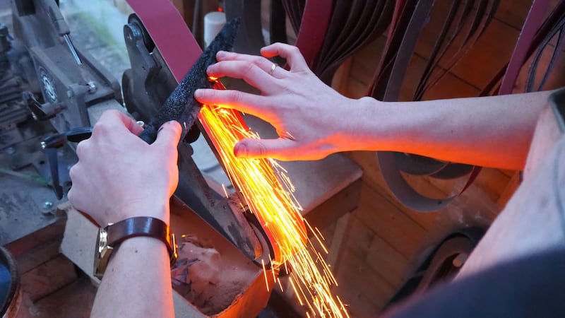 Hugo Byrne goes slowly. Otherwise the blade might lose its temper. Thoughts of sharp objects losing their tempers could lead you to worry about bloody carnage, but Byrne is at work, painstakingly grinding hot metal to make one of his highly covetable kitchen knives. The blade must be dipped in water frequently. If it gets too hot, it will lose its hardness and strength - the temper of the steel.