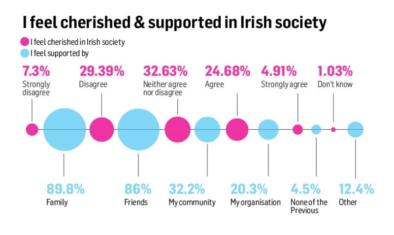 Scott was surprised by responses to Question 15, which was “I feel cherished in Irish society”, which had possible answers ranging from “strongly agree” to “strongly disagree” and “don’t know”. Roughly a fifth of all respondents skipped the question and, of those who answered, less than a third agreed. “I’m not sure why so many people skipped it.”