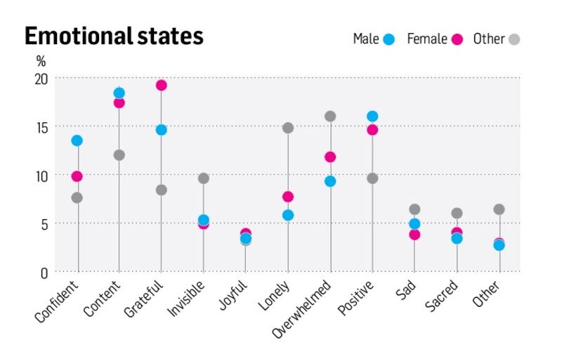 Question 27 asked people how they felt “most of the time”, with the options being “confident, content, grateful, invisible, joyful, lonely, overwhelmed, positive, sad, scared and other”. They were asked to choose no more than three (See graph overleaf). The top three feelings were “grateful”, “content” and “positive.” The fourth was “overwhelmed”, which was the highest negative response in all gender categories. Almost 10 per cent of respondents chose not to use any of the suggested words and wrote their own instead. These included, “Exhausted”, “bored”, “negative”, “tired”, “stressed”, disappointed”, “frustrated”, “insecure”, “lost”, “angry”, “numb” and “anxious”.