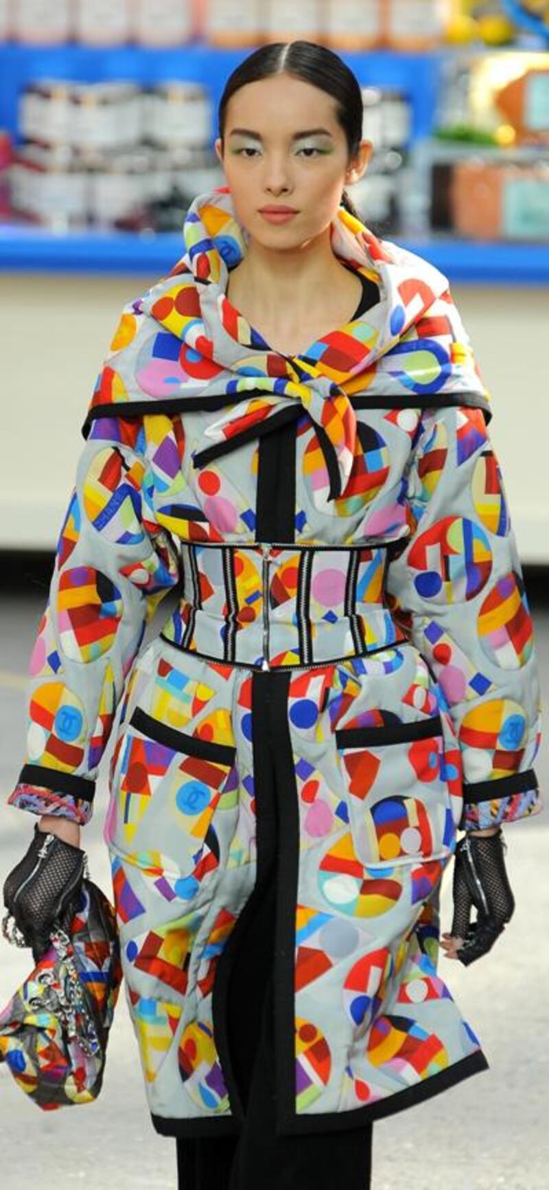 Chanel’s success as a global brand means it can make mischief with these notions in an extravagant and subversive way. In a departure from the usual catwalk parade, jaunty models in sparkling runners and swinging ponytails scoured the stacked supermarket shelves like everyday shoppers checking out everything from chainsaws to chocolate, but dressed in the best that money can buy. That included multicoloured tweeds, silvered mesh tunics, bright green car coats and even pink racerbacks with matching leggings, fashionably holed with midriffs bared.