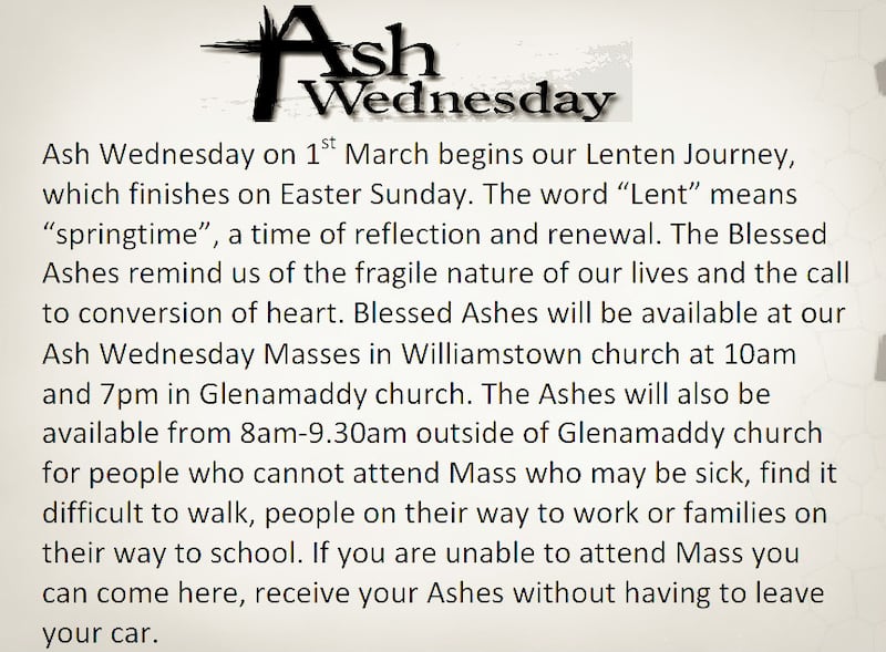 As the Glenamaddy parish newsletter notes this week, "The Ashes will also be available from 8am-9.30am outside of Glenamaddy church for people who cannot attend Mass who may be sick, find it difficult to walk, people on their way to work, or families on their way to school. If you are unable to attend Mass you can come here, receive your Ashes without having to leave your car."
