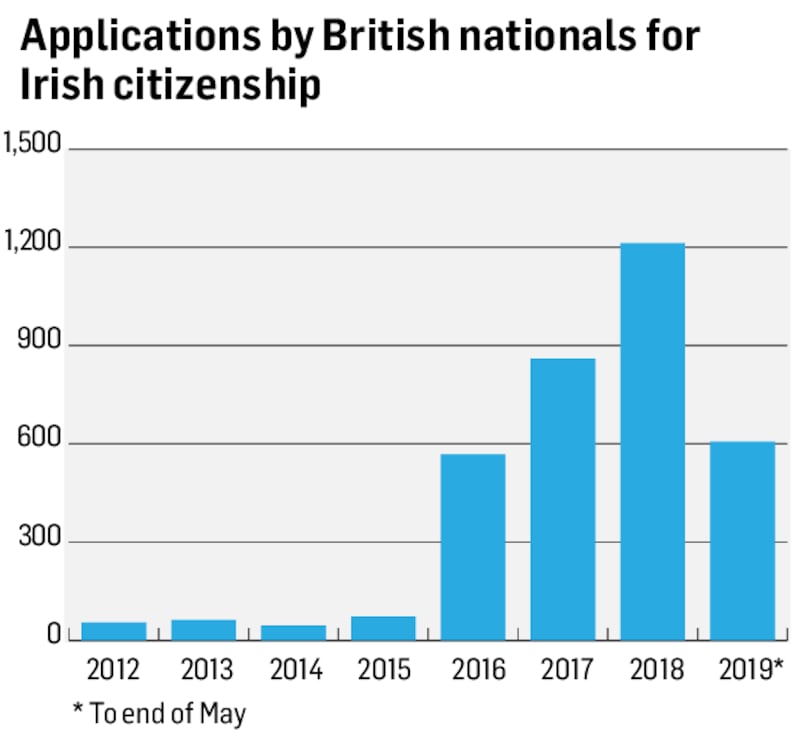The busiest day ever on inis.gov.ie was after the 2016 Brexit result, when phonelines were also jammed. There’s a popular impression of a tsunami of applications for Irish citizenship from UK nationals since the Brexit vote. A senior manager in Inis says there has been a tenfold increase in applications from Britain, but this from a very low base. An average 60 British citizens a year were naturalised between 2011 and 2016. In 2017-2018 the average was 589. British citizens made up 15 per cent of naturalisations in the first half of 2019.