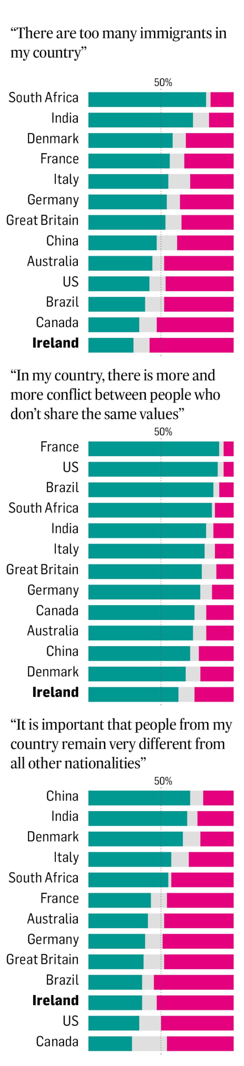 In the ethnicity and equality section of today's Ipsos Global Trends 2021 study, researchers pose the statement – There are too many immigrants in my country. Ireland scores very positively on the chart, with less than a third (31 per cent) agreeing with this claim, compared with 56 per cent in France and 53 per cent in Britain. However, who were Irish participants thinking of when they answered that question?